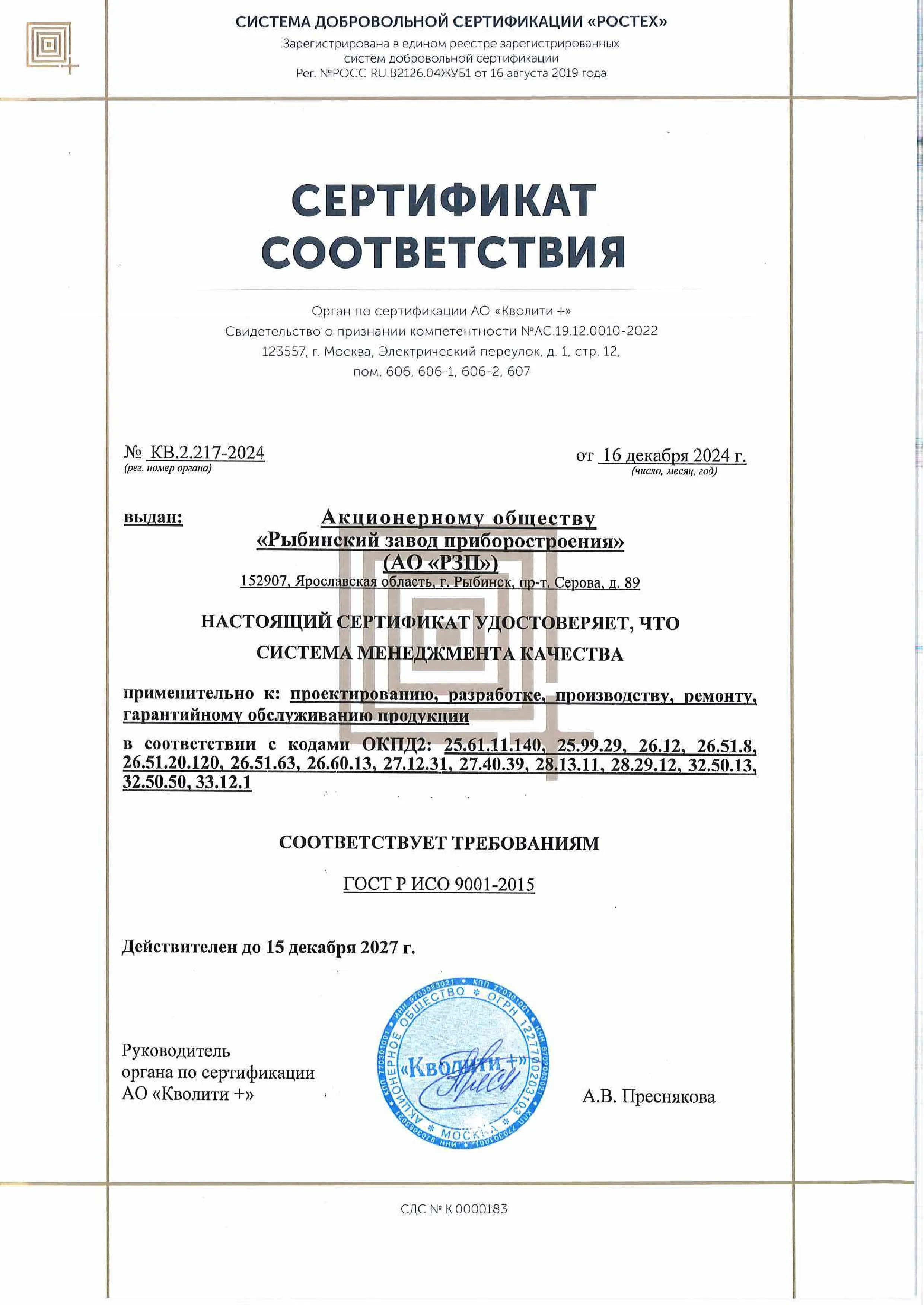 Система менеджмента качества предприятия сертифицирована и соответствует требованиям ГОСТ Р ИСО 9001:2015, ГОСТ РВ 0015-002-2020 и другим применяемым стандартам.